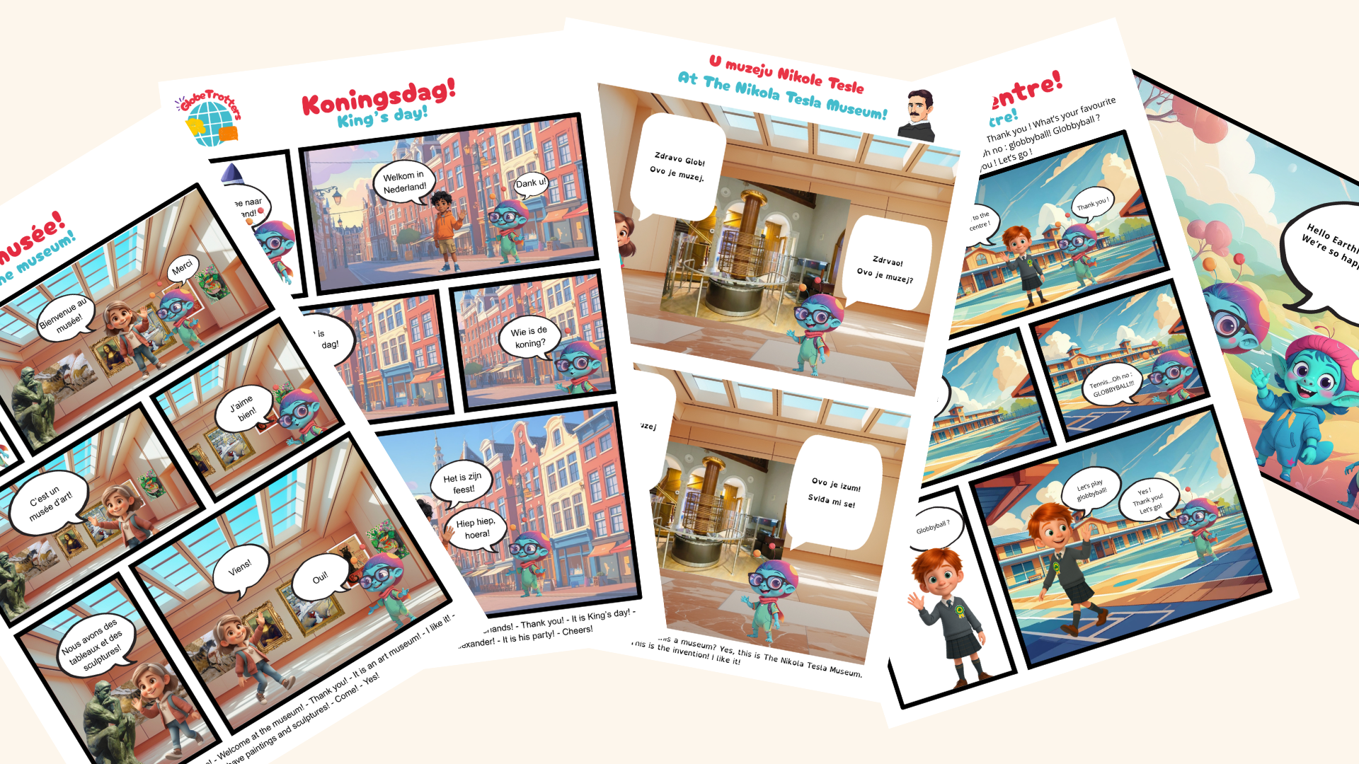 Στο έργο Globetrotters, οι μαθητές και οι μαθήτριες γνωρίζουν παιδικούς χαρακτήρες – ξεναγούς από διαφορετικές χώρες, καθώς και εξωγήινους χαρακτήρες που ταξιδεύουν σε διάφορες ευρωπαϊκές χώρες εξερευνώντας τις γλώσσες και τους πολιτισμούς τους. Πολλά από τα πακέτα φυσικής δραστηριότητας του Globetrotters παρέχουν έτοιμα προς εκτύπωση κόμικς (π.χ. γαλλικά: Στο Μουσείο· ελληνικά: Στο Πανηγύρι· αγγλικά: Στο Αθλητικό Κέντρο· σερβικά: Στο Μουσείο του Nikola Tesla· ολλανδικά: Στο Εστιατόριο· γερμανικά: Στο Σχολείο). Επιπλέον, τα μίνι παιχνίδια του Globetrotters διαθέτουν οπτικό σχεδιασμό σε στιλ κόμικς τόσο στο υλικό φυσικής δραστηριότητας όσο και στην ψηφιακή πλατφόρμα με το Genially, εξασφαλίζοντας μια συνεκτική και ελκυστική μαθησιακή εμπειρία.